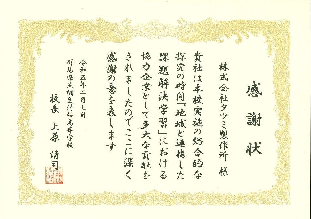 清桜高等学校様から感謝状を頂きました。